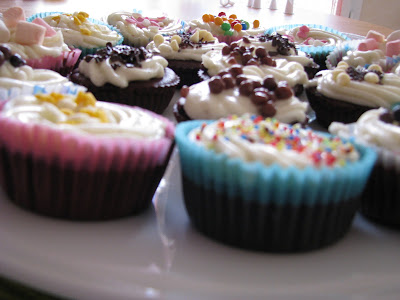 Entretanto prepara-se o creme, misturando o açúcar em pó com o mascarpone e com a polpa da baunilha (abre-se a vagem ao meio e raspa-se o interior, é nas sementes que há maior concentração de aromas e sabores). Mete-se este preparado num saco de pasteleiro (usei o bico estrelado), guarnecem-se os cupcakes e decoram-se a gosto.