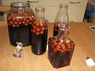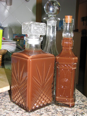 Aqui estão eles a aguardar prova, o de chocolate na garrafa maior e o de chocolate com piripiri na garrafa mais pequena.